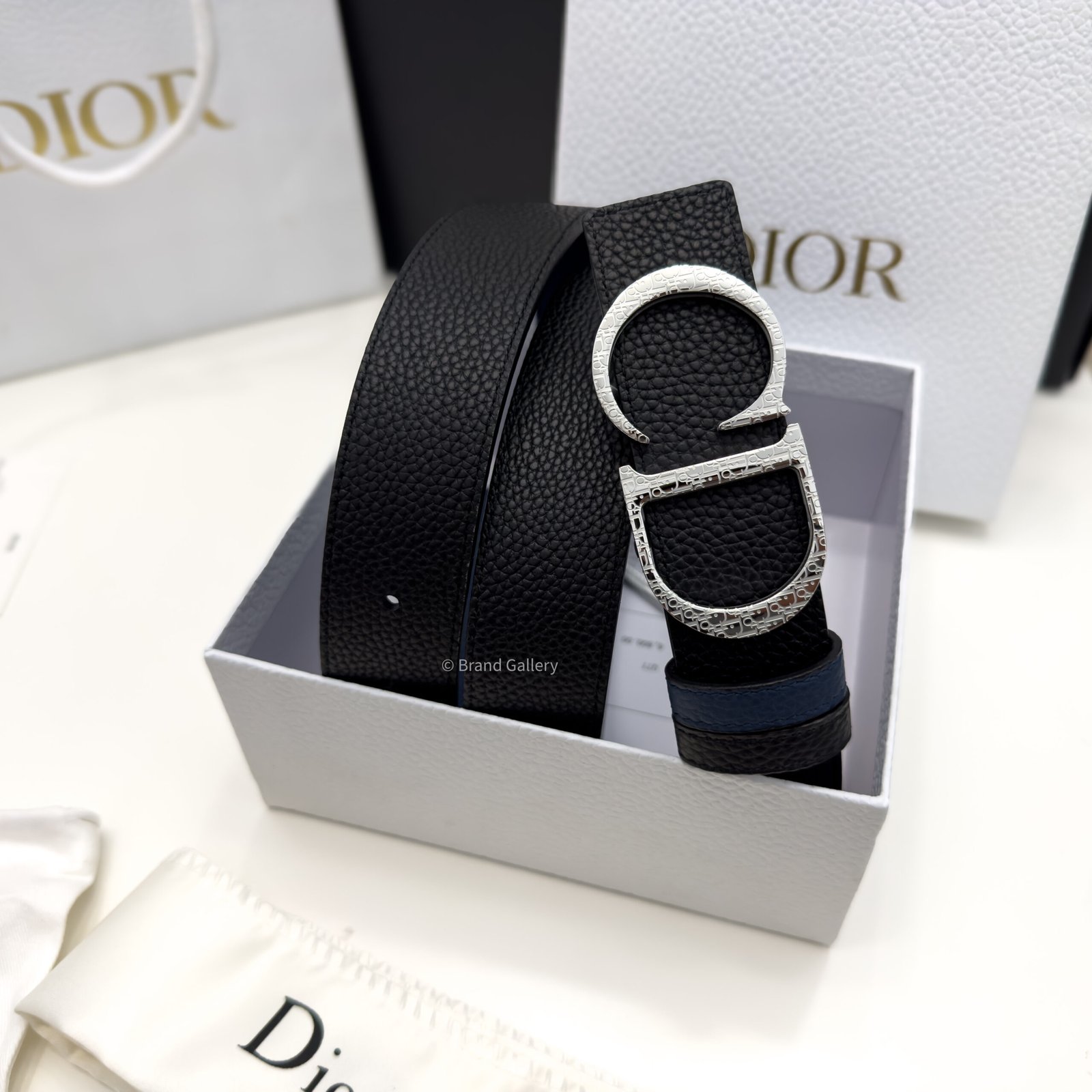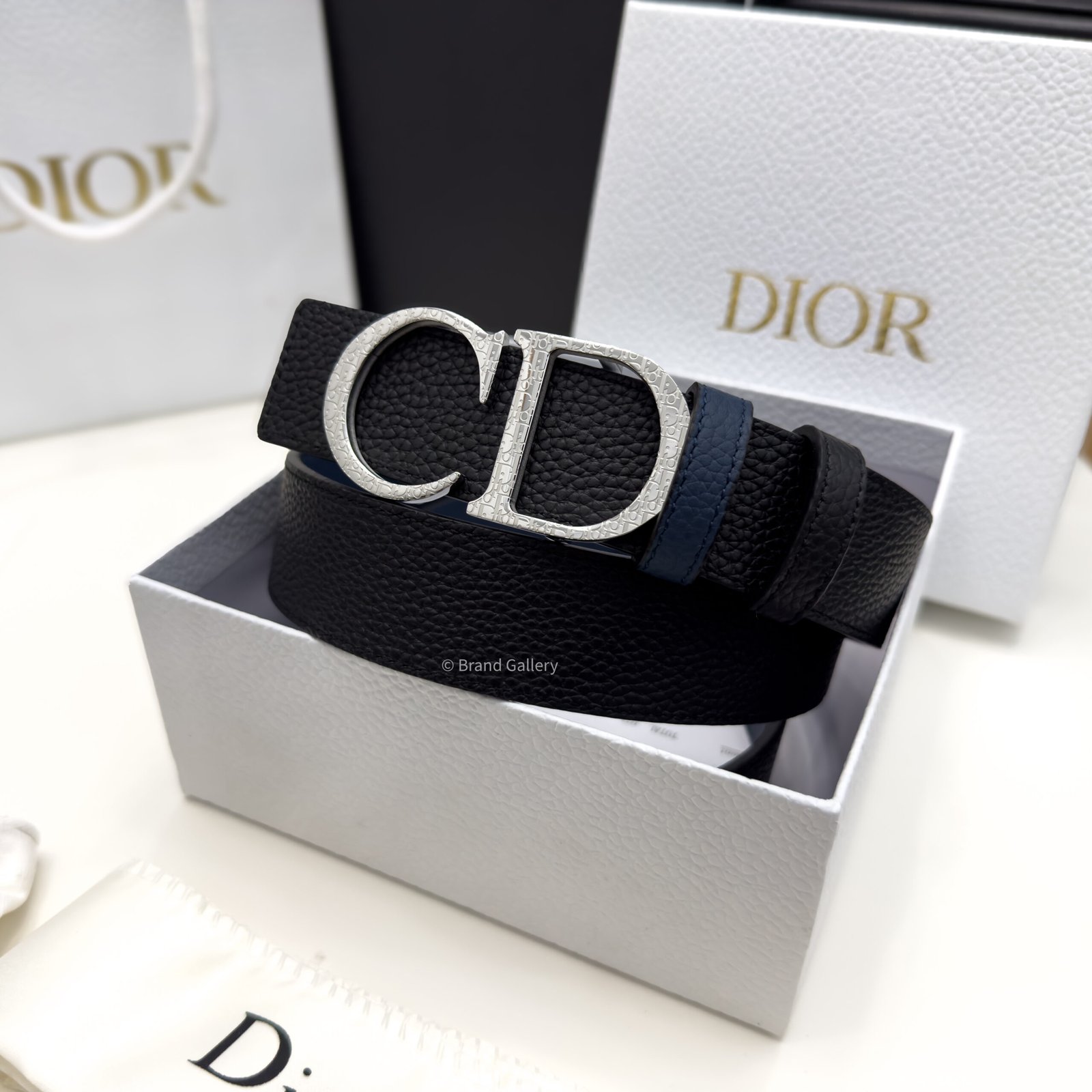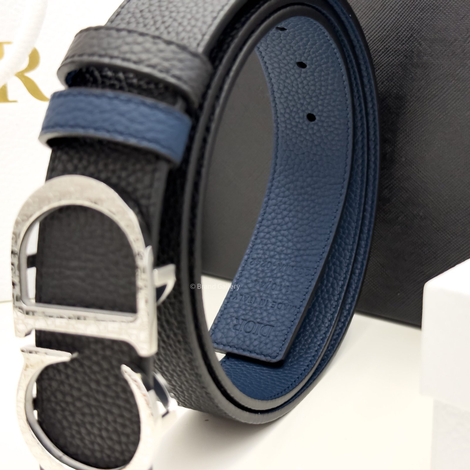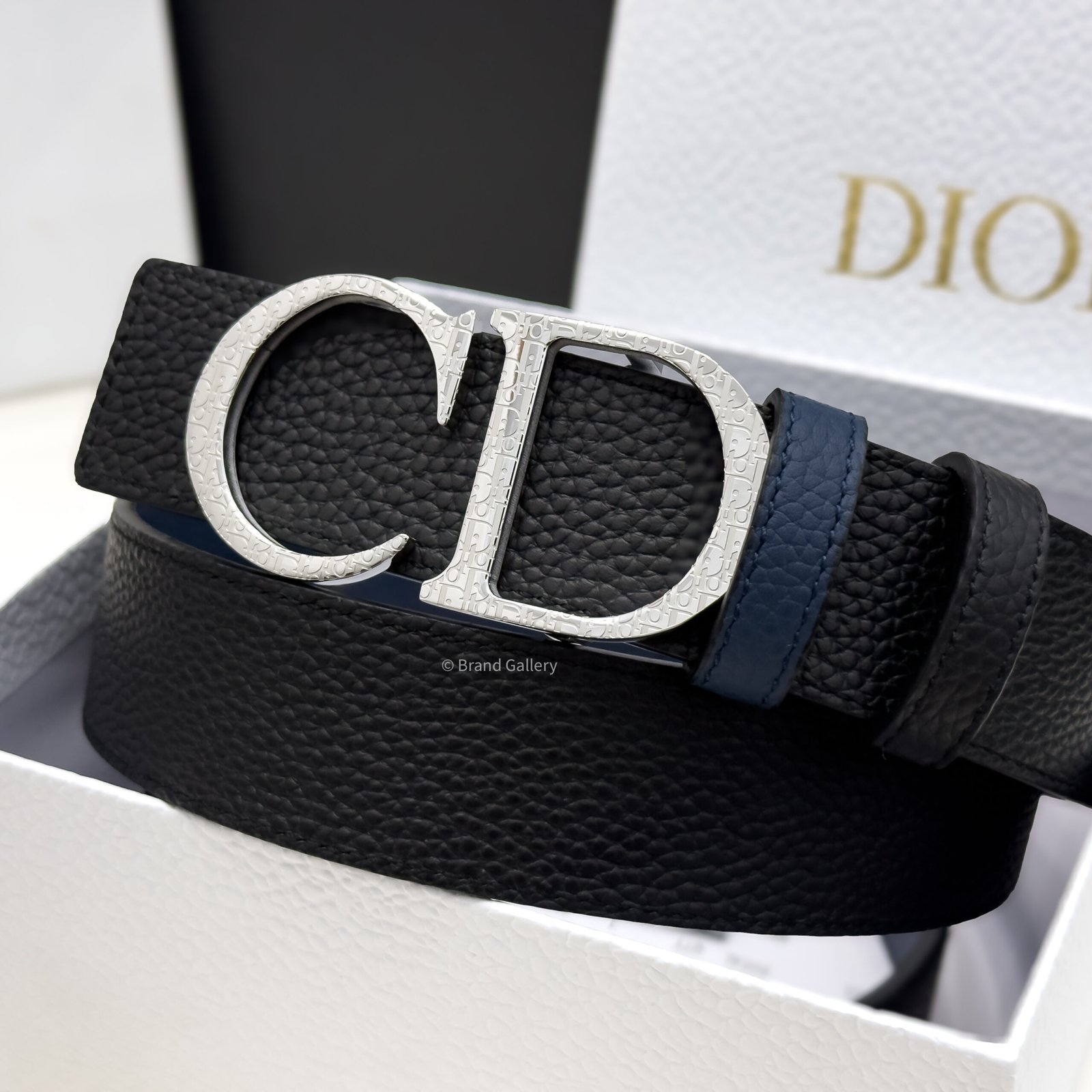 Combining elegance and modernity, the belt is crafted in black grain leather with blue grained leather and embellished with a silver CD buckle. The 35-mm belt can be paired with any casual attire.