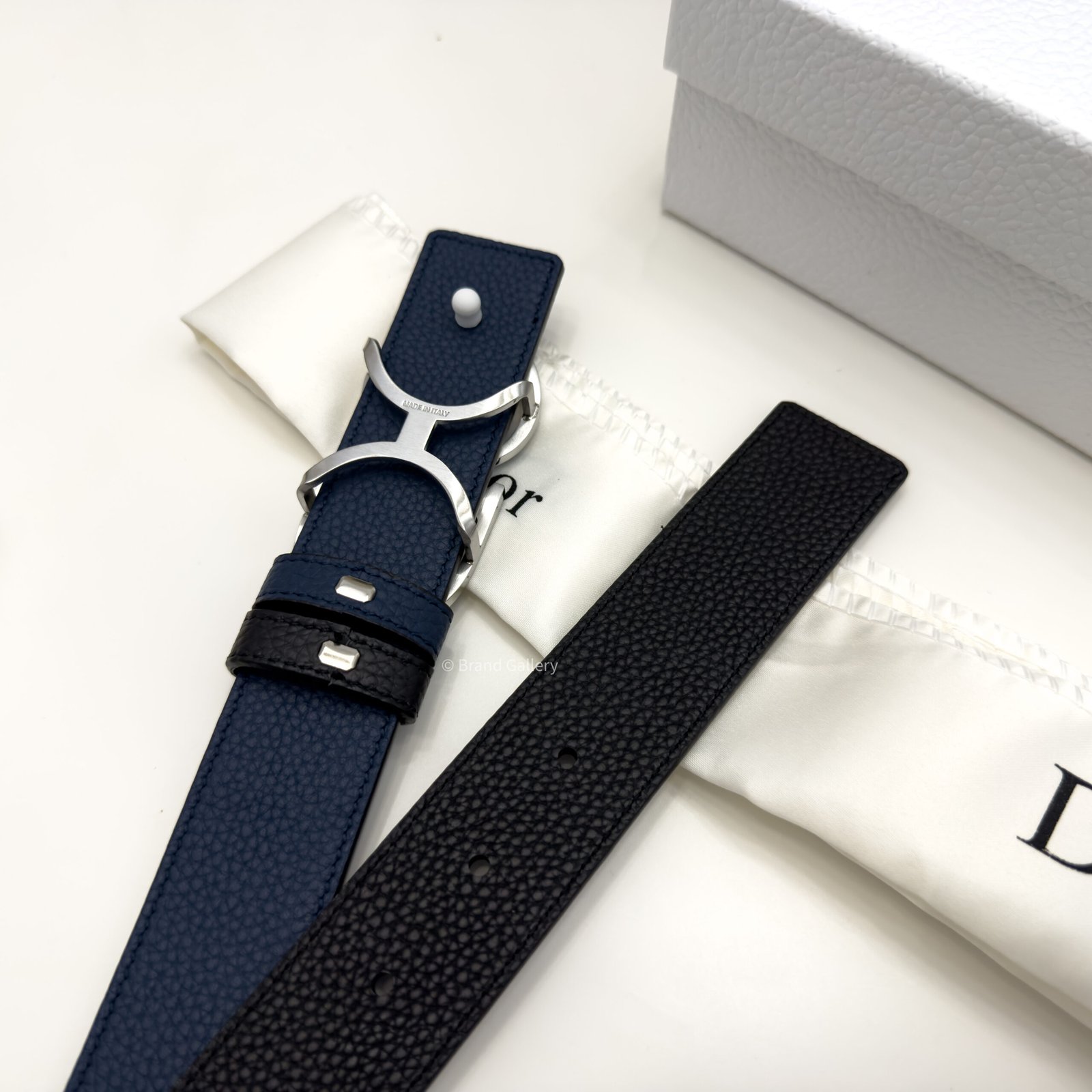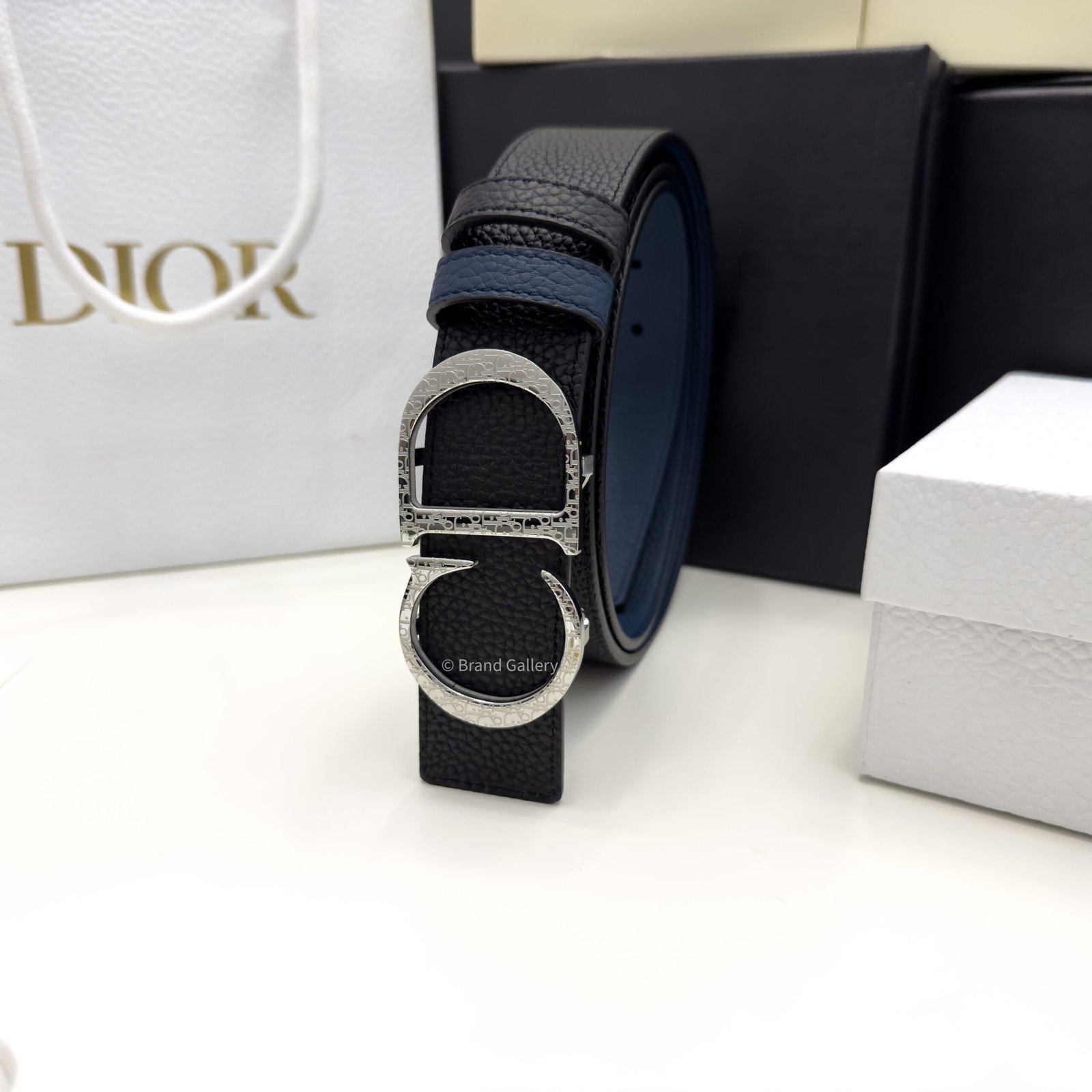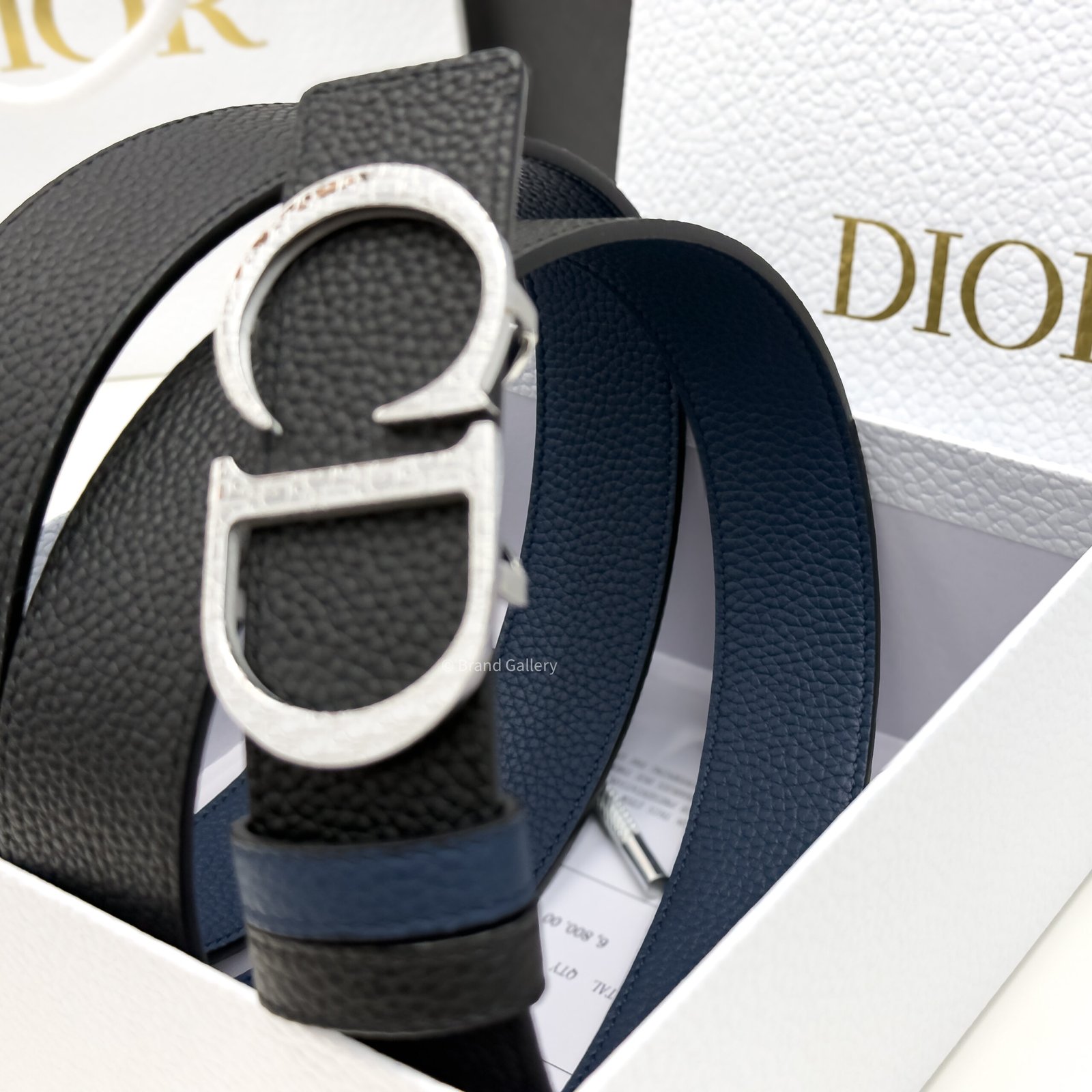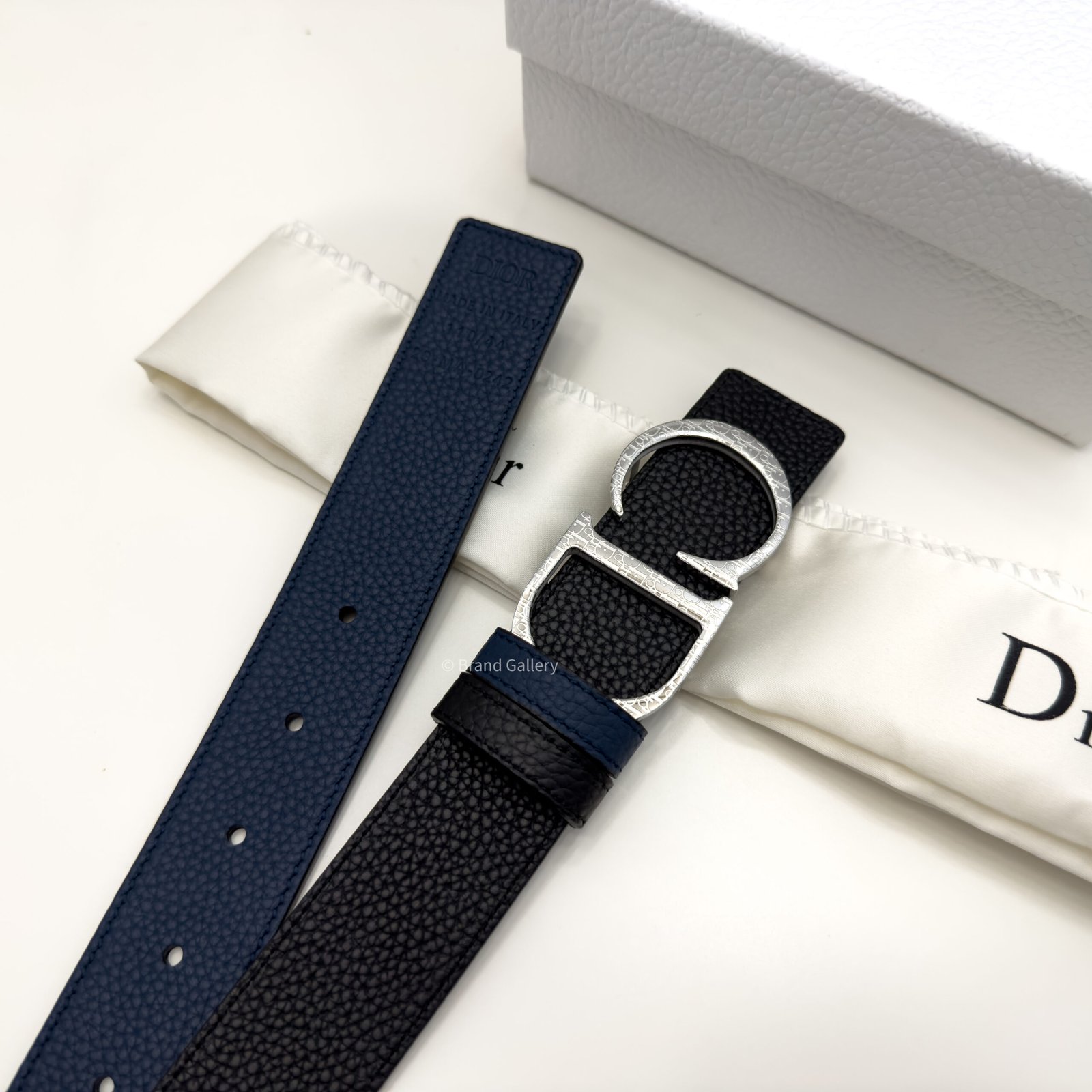 Combining elegance and modernity, the belt is crafted in black grain leather with blue grained leather and embellished with a silver CD buckle. The 35-mm belt can be paired with any casual attire.