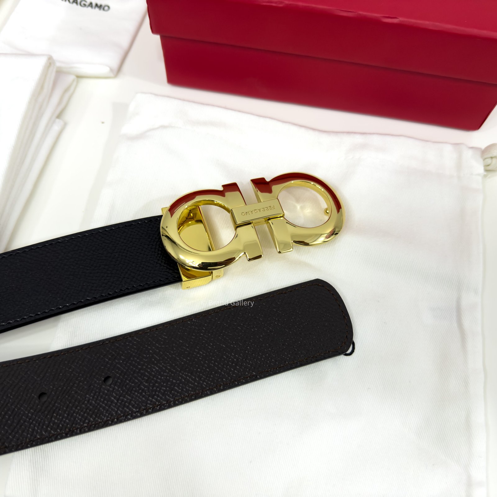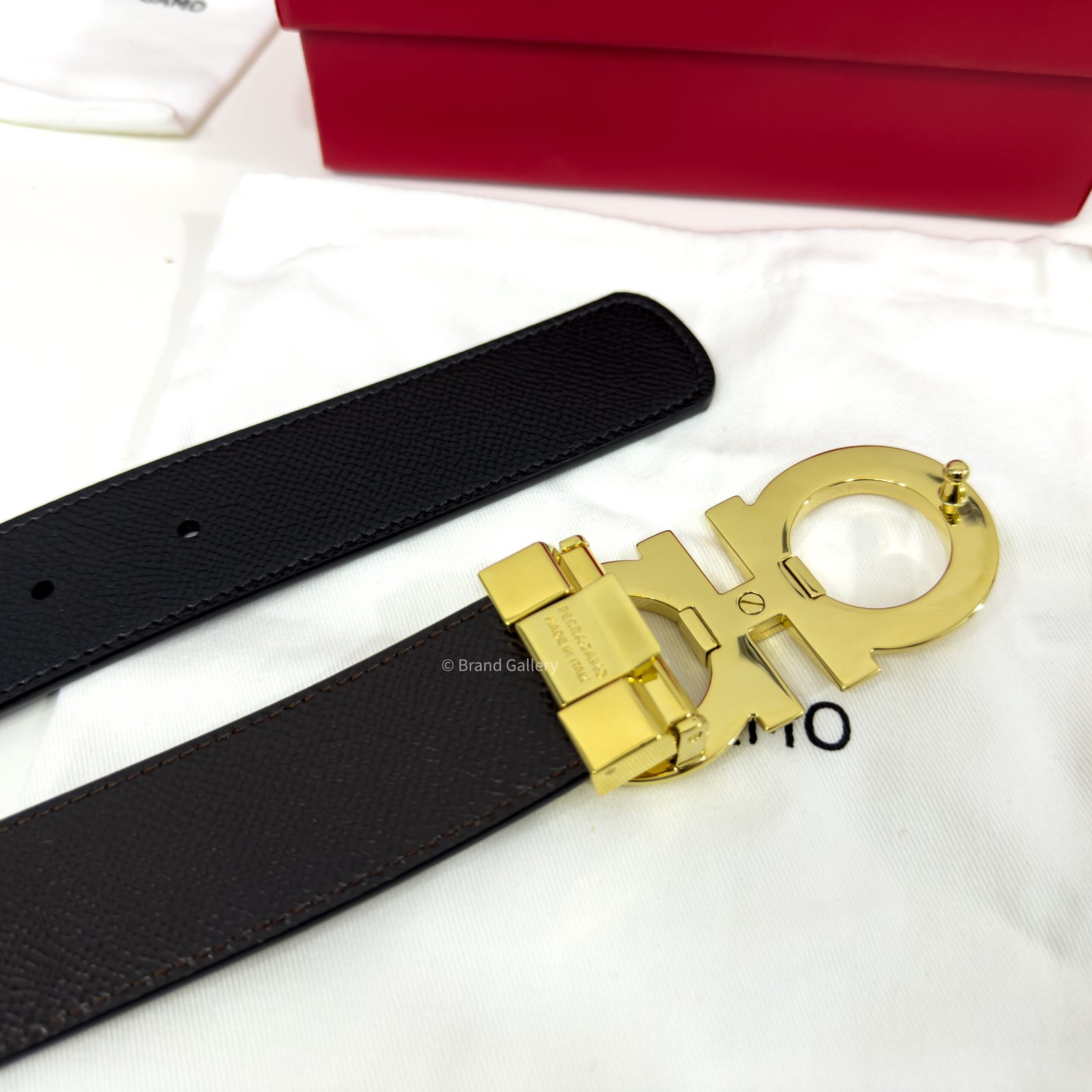 Gancini stainless steel pin buckle in Gold finish. Self-adjustable, 3.5 cm x 125 cm, reversible strap in plain black leather on one side and Dark Brown plain on the other. A versatile accessory, conceived for a bold look.