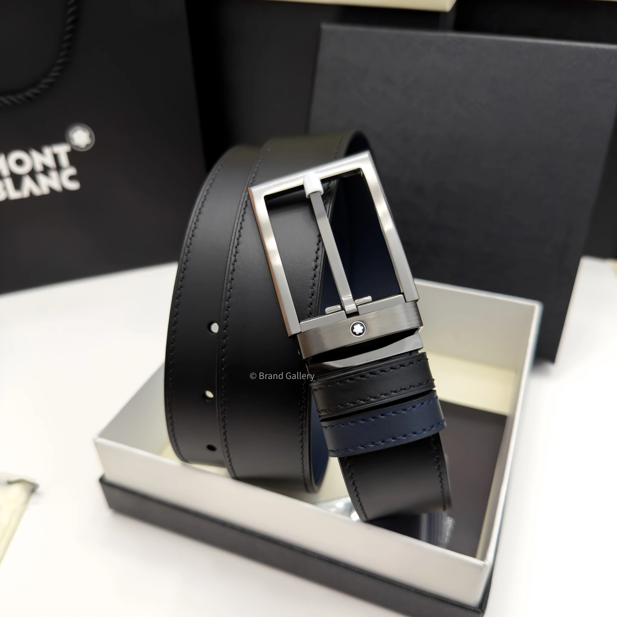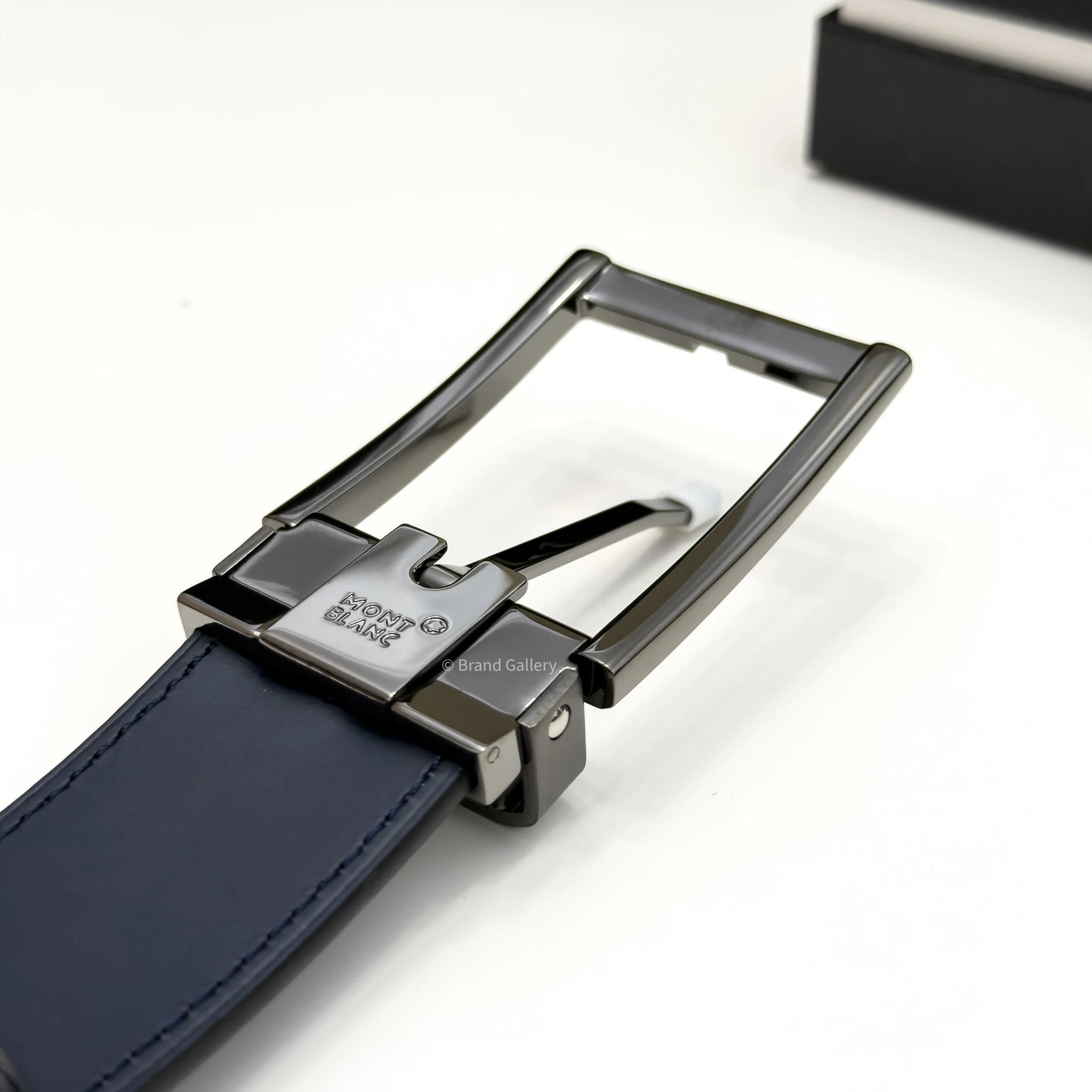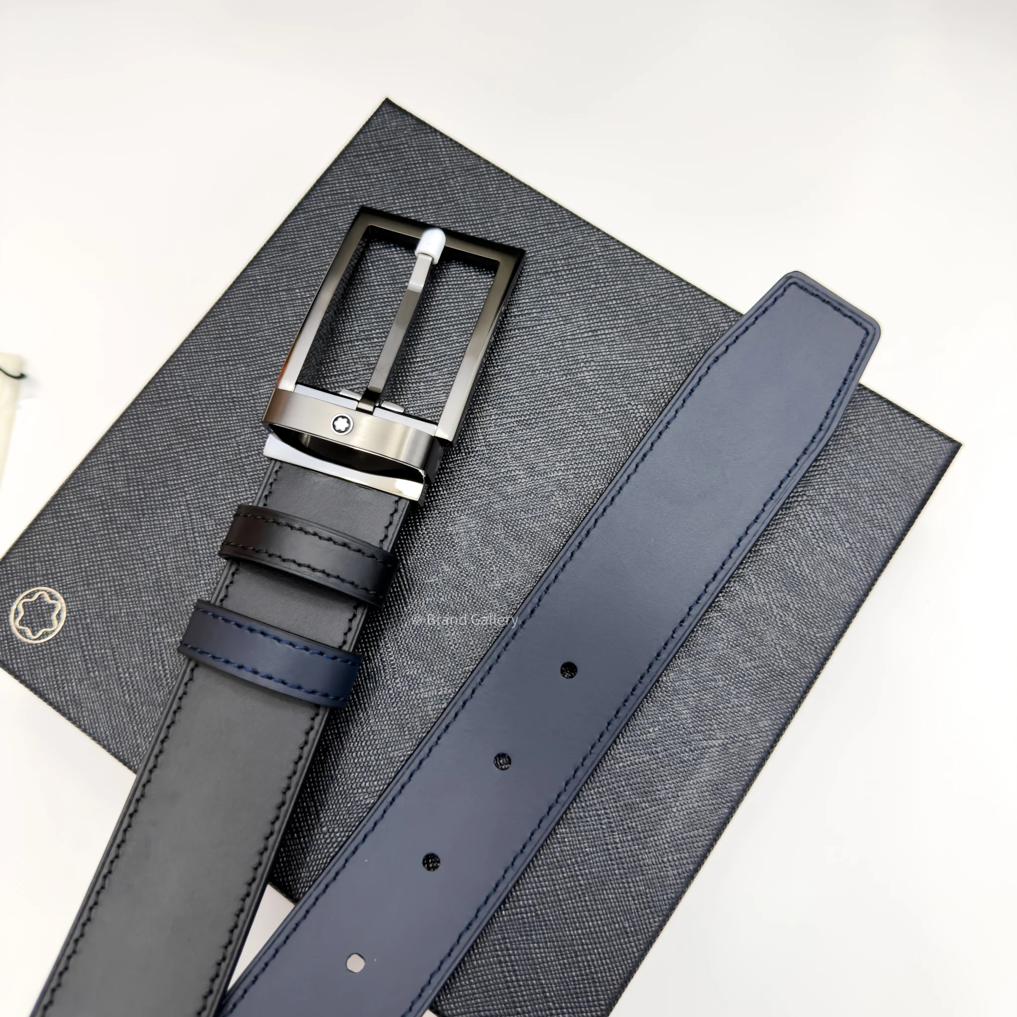 Discover the reversible 35 mm belt which combines the sleek design of a Gun-metal Stainless steel rectangle buckle with the versatility of two distinct leather straps. The buckle, featuring a sleek, shiny palladium finish. The belt strap offers versatility and refinement, featuring two distinct looks in one accessory. One side showcases blue plain leather, while the reverse features sleek black plain leather for a timeless, polished finish.