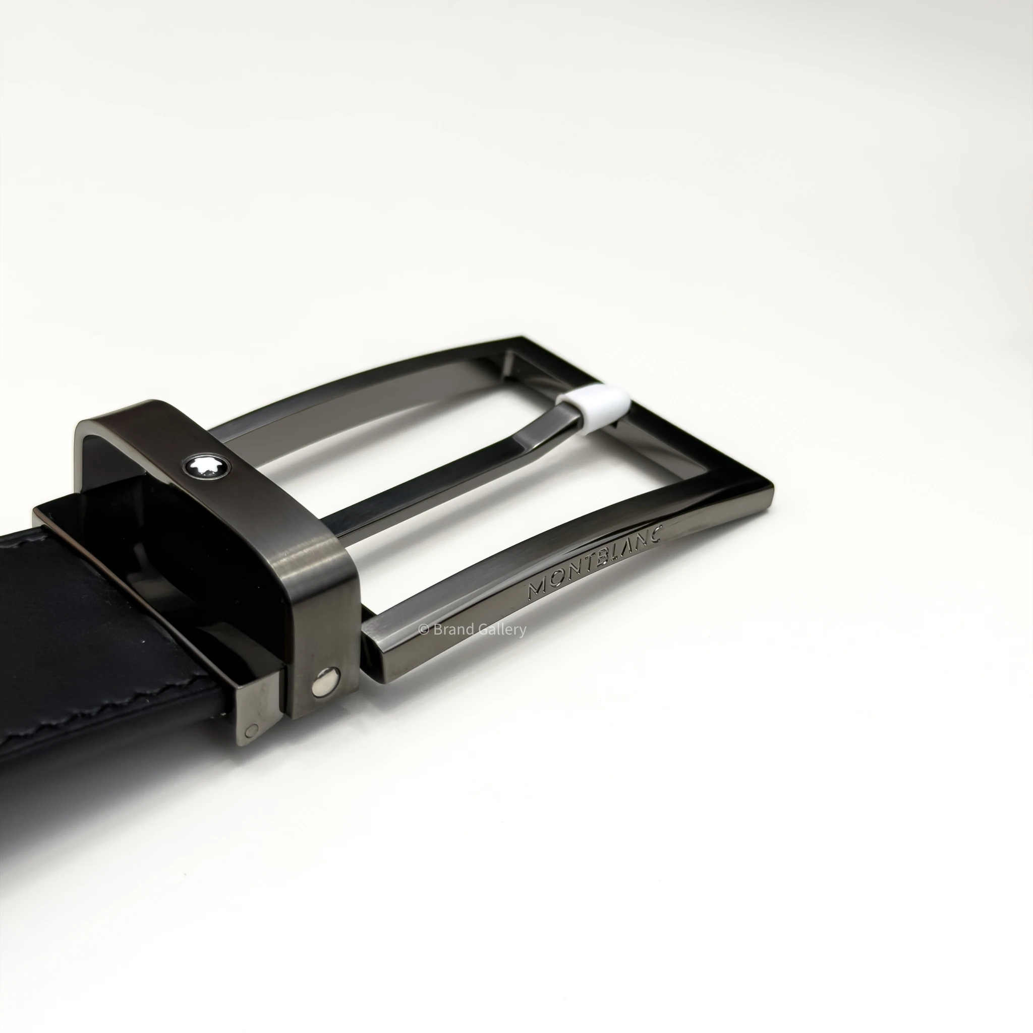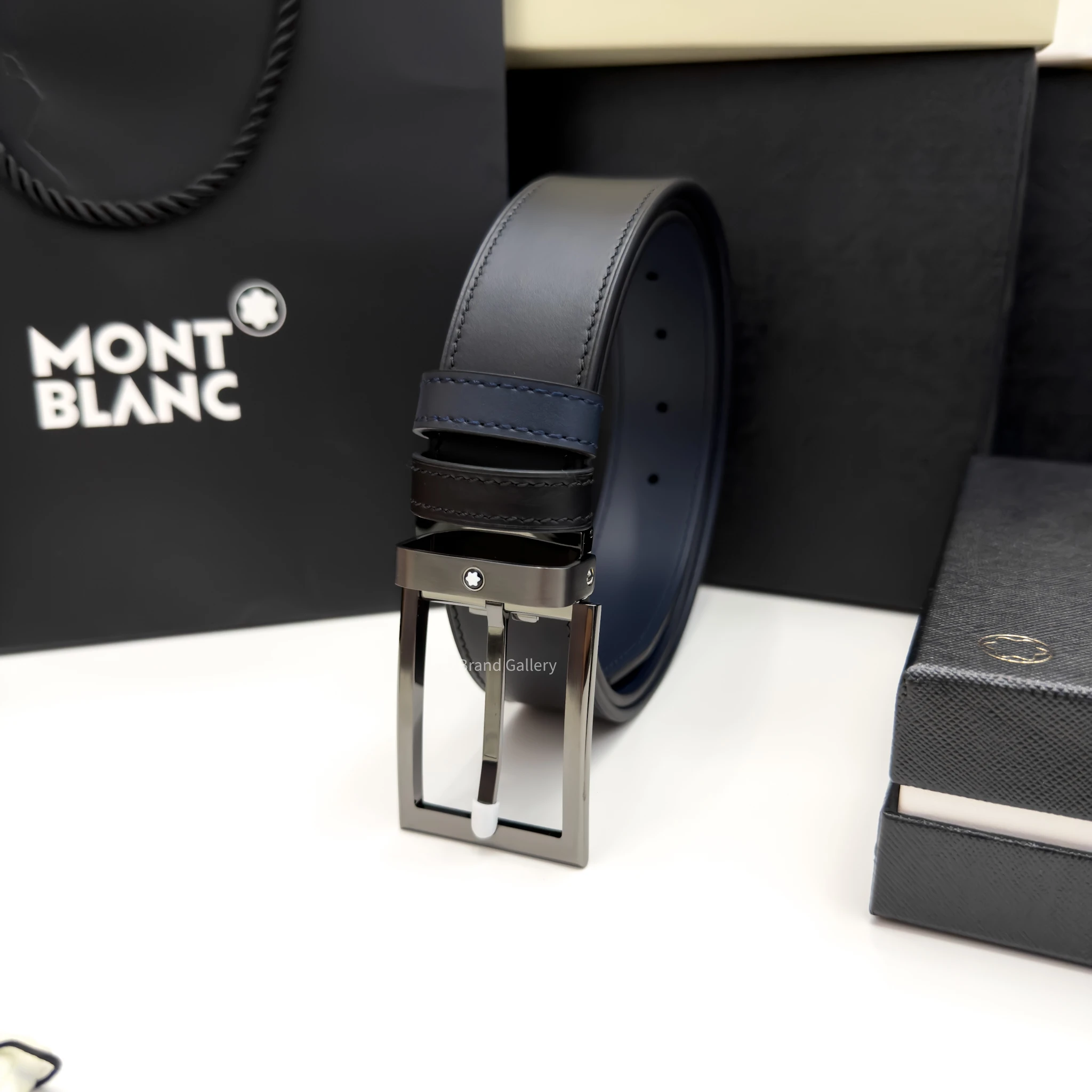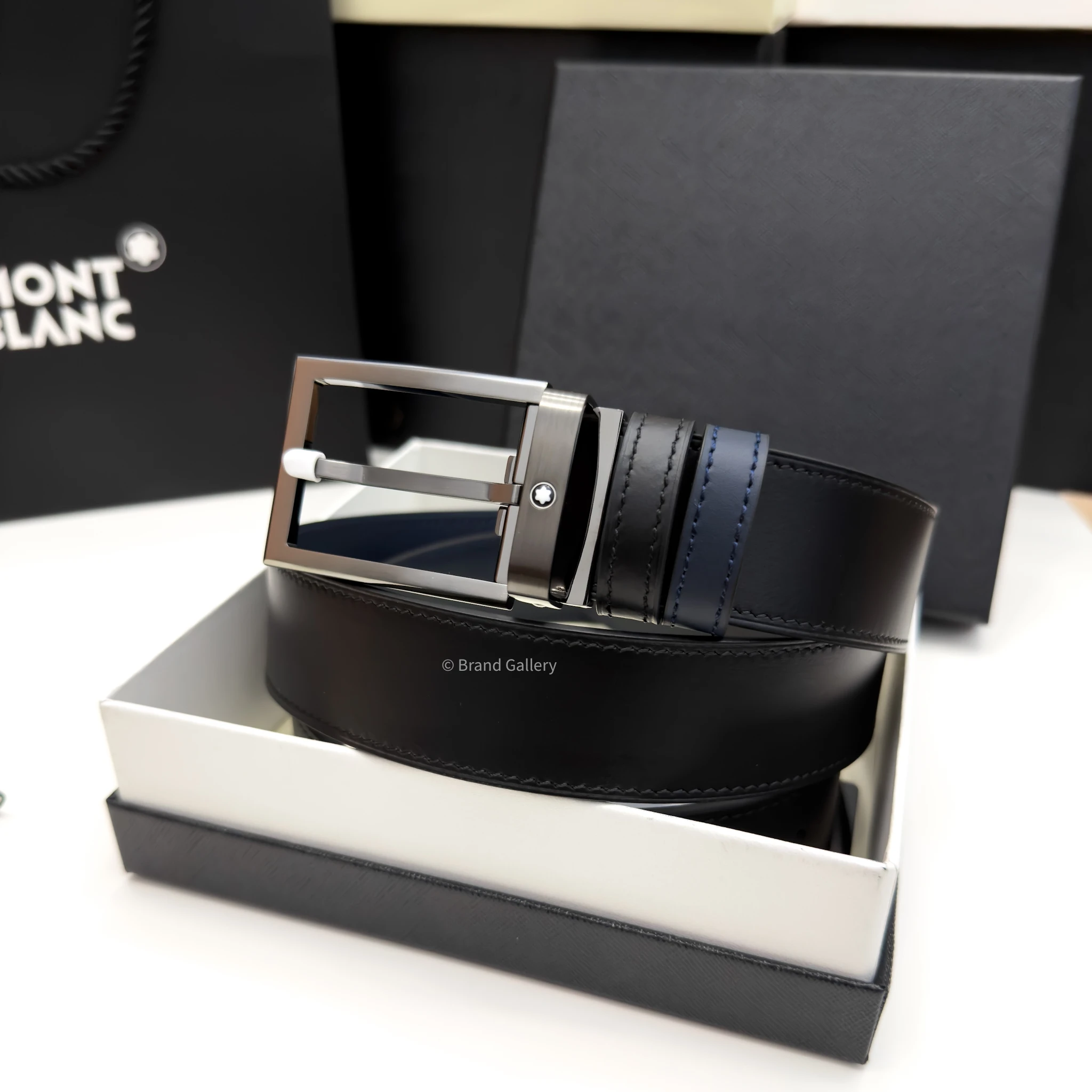 Discover the reversible 35 mm belt which combines the sleek design of a Gun-metal Stainless steel rectangle buckle with the versatility of two distinct leather straps. The buckle, featuring a sleek, shiny palladium finish. The belt strap offers versatility and refinement, featuring two distinct looks in one accessory. One side showcases blue plain leather, while the reverse features sleek black plain leather for a timeless, polished finish.