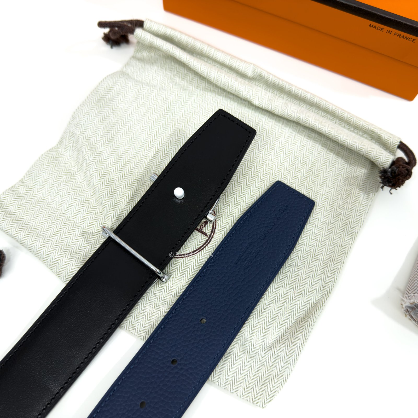 & Reversible leather strap in Chamonix 135 and Togo calfskin.